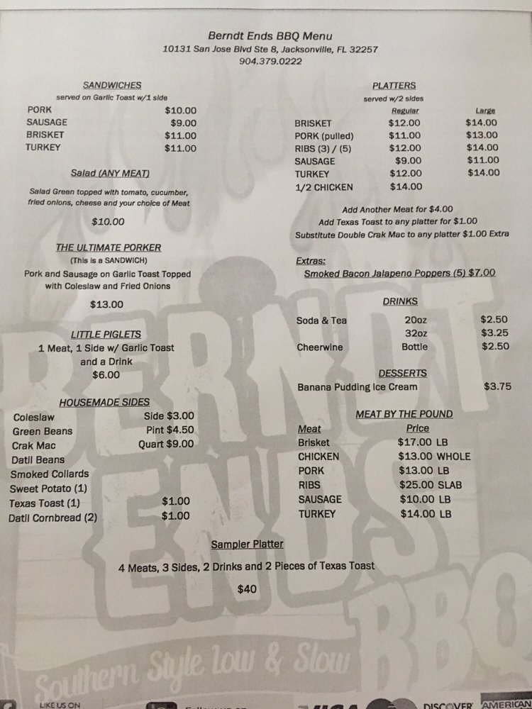 Berndt Ends Bbq Menu Jacksonville Order Berndt Ends Bbq Delivery Online Postmates